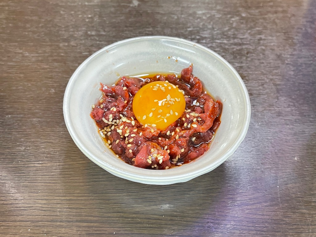 人気メニュー「桜ユッケ(650円)」は、とろける卵黄と甘辛ダレが絡む贅沢な一皿。
