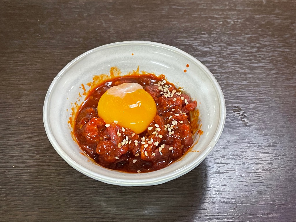 西千葉のカウンターには【桜ユッケ 650円】が並ぶ。