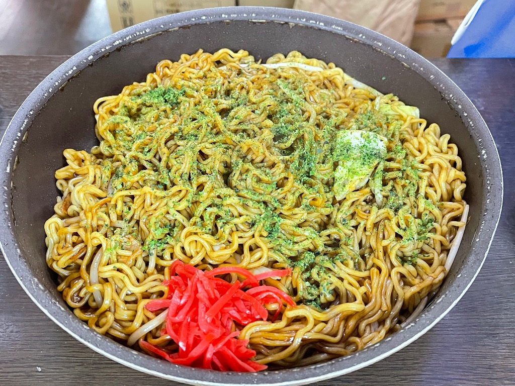 フライパンいっぱいに広がる、約1kgの焼きそば。